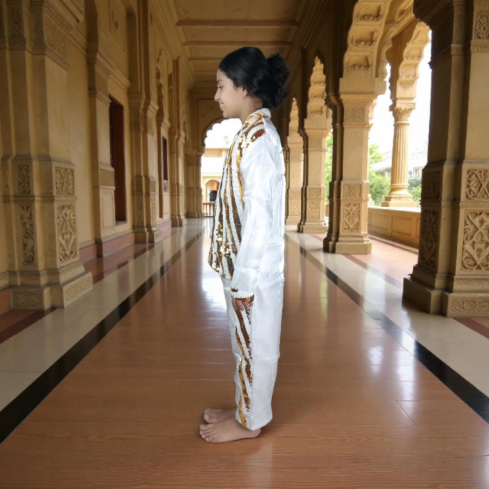 This White & Golden Western Boys Fancy Dress is specially designed for school fancy dress competitions, annual functions, and theme-based events. The dress features a bright white base with elegant golden detailing, giving a smart, clean, and graceful western look suitable for stage performances.